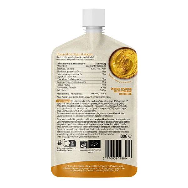 Pois chiches cuits* (44%), eau, huile d’olive extra vierge* (12%), quinoa cuit*, oignon*, ail*, sel de Camargue (0.5%), sucre rapadura*, jus de citron* (0.5%), curry* (0.3%).