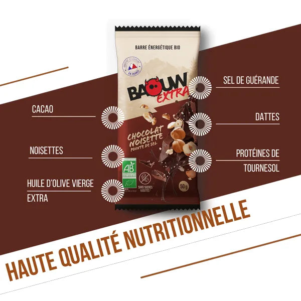 Barre Baouw Extra Chocolat - Noisette : dattes*, noisettes* 18%, protéines de tournesol*, purée de noisette*, cacao en poudre* 5%, pâte de pommes* (jus de pomme concentré*, purée de pommes concentrée*), graines de sarrasin toastées*, huile d'olive vierge extra*, fèves de cacao* 1%, sel de Guérande 1%, farine de riz*.