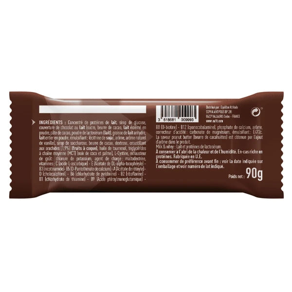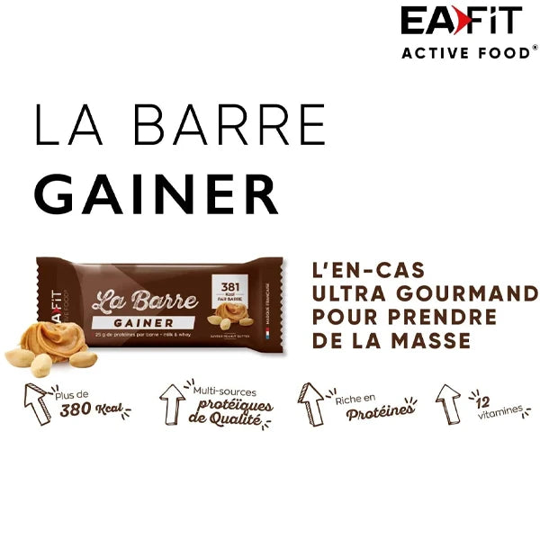 Eafit La Barre Gainer 90g est une barre protéinée spécialement conçue pour compléter vos apports caloriques et protéiques tout au long de la journée. Avec sa composition riche en beurre de cacahuète, cette barre est une source de protéines de lait concentrées. Elle est également enrichie en vitamines essentielles telles que la vitamine A, la vitamine E, la vitamine D, la vitamine C, la vitamine B1, la vitamine B2, la vitamine B3, la vitamine B5, la vitamine B6, la vitamine B8, la vitamine B9, et la vitamine B12, ainsi qu'en calcium et en phosphore. Chaque barre de 90g apporte 374 kcal, 13g de matières grasses, 40g de glucides, 25g de protéines, et divers minéraux et vitamines.