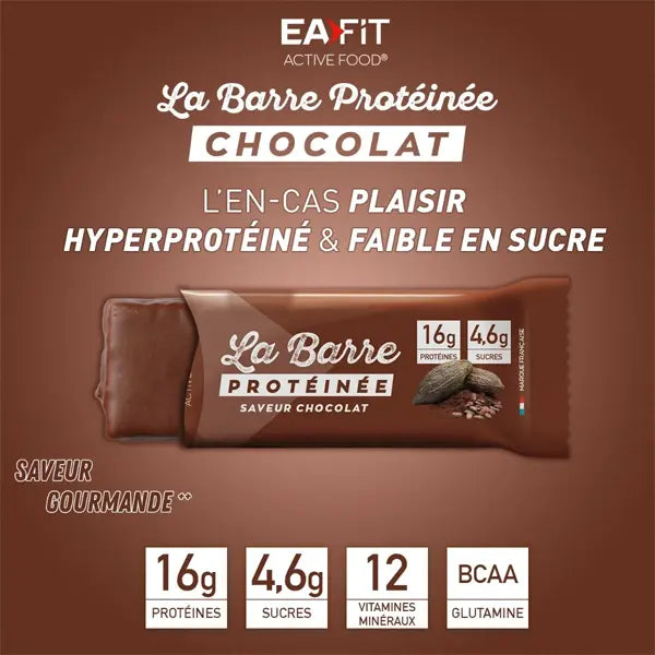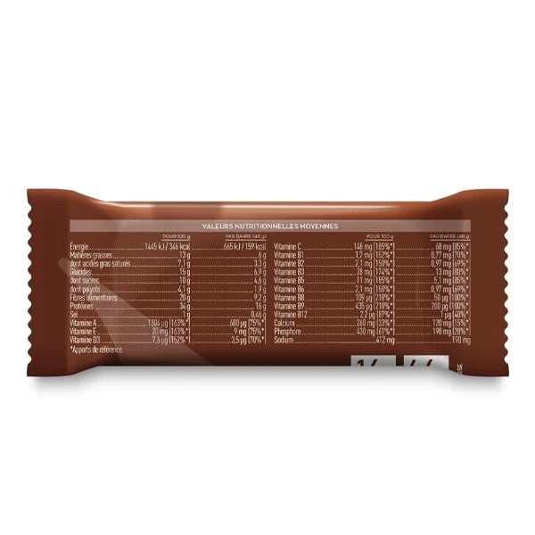 Concentré de protéines de lait, sirop d’oligofructose, couverture de chocolat au lait (sucre, beurre de cacao, lait écrémé en poudre, pâte de cacao, protéines de lactosérum (lait), beurre anhydre (lait), lait entier en poudre, émulsifiant (lécithine de soja), arôme et arôme naturel de vanille), sirop de polydextrose, humectant : sirop de sorbitol, beurre de cacao, huile de tournesol, poudre de cacao dégraissé (1,4%), minéraux : citrate de sodium - phosphate de calcium - phosphate de sodium; arômes (contiennent du lait), L-cystine, exhausteur de gout : chlorure de potassium, vitamines : C (acide L-ascorbique) - E (Acétate de DL-alpha-tocophéryle) - B3 (nicotinamide) - B5 (D-Pantothénate de calcium) - A (acétate de rétinyle) - D (Cholécalciférol) - B6 (chlorhydrate de pyridoxine) - B2 (riboflavine) - B1 (chlorhydrate de thiamine) - B9 (acide ptéroylmonoglutamique) - B8 (D-biotine) - B12 (cyanocobalamine), agent de charge : cellulose.