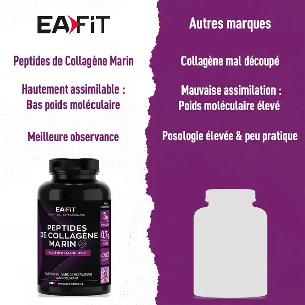 Le Collagène marin hydrolysé EAFIT - 120 comprimés est spécialement conçu pour répondre aux besoins des sportifs et des personnes actives souhaitant préserver leur mobilité et maintenir des articulations en bonne santé. Grâce à une formule innovante et une hydrolyse enzymatique, ce produit offre une haute assimilation et cible efficacement les tissus conjonctifs pour un confort optimal.