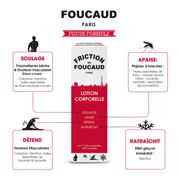 Après la douche ou le sport, elle s’applique en friction du plat de la main sur les muscles et les articulations. La Friction de Foucaud procure une sensation unique de tonus, de fraîcheur et de bien-être.