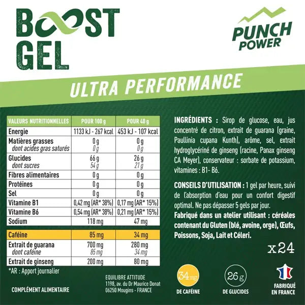 Conçu pour les efforts intenses, les phases de baisse d’énergie ou les compétitions, BOOST GEL de Punch Power est un gel énergétique ultra-performant à base de glucides rapides, caféine, vitamines B1 et B6 et sodium. Son format nomade, son goût agréable et son efficacité immédiate en font un allié incontournable pour les sportifs en quête de performance.